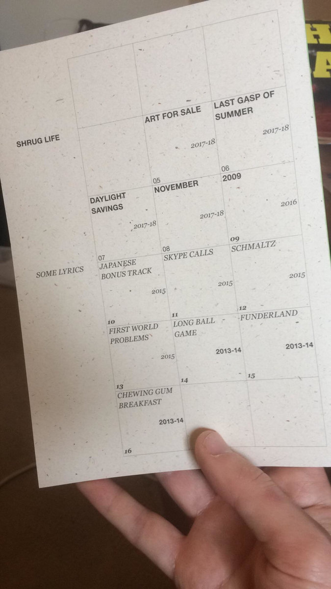 Selected Shrug Life lyrics from across past and future releases. Includes an introductory essay by Danny Carroll on lyric writing. Layout and design by Beibhinn Delaney